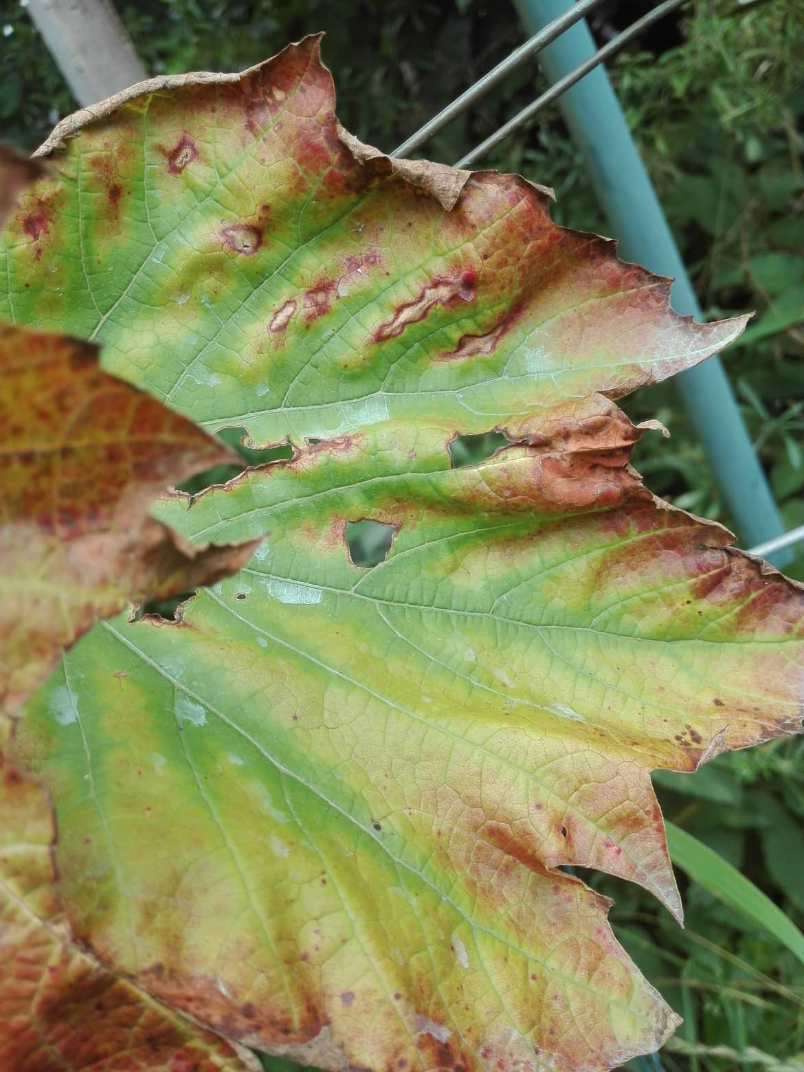 Zklamali jste mě, pánové. Čekal jsem, že se tady strhne mela mezi příznivci a odpůrci populární černé hniloby a ono nic. Příznivci zarytě mlčí, kupodivu tentokrát se chopili slova jen odpůrci, kteří téměř mlčeli v předešlých případech, když se to tady několikrát řešilo. No nic. Tak se tedy přiznám. .... Byl to chyták! Který mi ale bohužel moc nevyšel. Fňuk. Správnou příčinu postižení listů na fotkách se však nikomu určit nepovedlo. Ale to by se nepovedlo asi nikomu, protože tento vizuální projev není pro danou poruchu (není to choroba) typický. Jedná se o nedostatek hořčíku na podnožové odrůdě Binova (mívá tmavé - modré plody), která roste v půdě s nízkým Ph. Přikládám fotky dalších listů stejného keře, kde je projev této poruchy trochu typičtější, než na těch třech původních fotkách. Ale přesto zdaleka není  typický, učebnicový pro deficit Mg. Proto bych chtěl na tomto příkladu ukázat, jak je obtížné a nejisté podle zbarvení chlorotických listů tipovat a hádat deficity konkrétních výživových prvků.