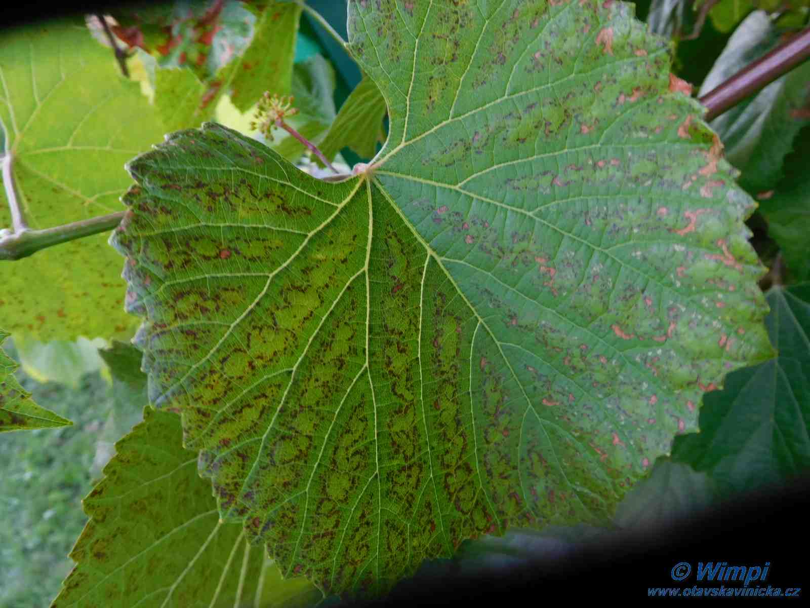 Presne toto jsem fotila 6.7. Vcera jsem cely den byla pric. Kdyz jsem se vracela domu, vspomnela jsem, ze na najakem kere jsem videla na stonkach divne cerne tecky. Vecer jsem vsechno obesla zas a byl to Cimus. Jeden letorost mel vyrazne cerne tecky. Jako obrazek z ucebnice. Plus par velkych listu take posete  teckami. Plus jeste jeden letorost jen trochu. Vse jsem odstranila i s hrozny. Bohuzel jsem to nevyfotila, uz byla docela tma :(.