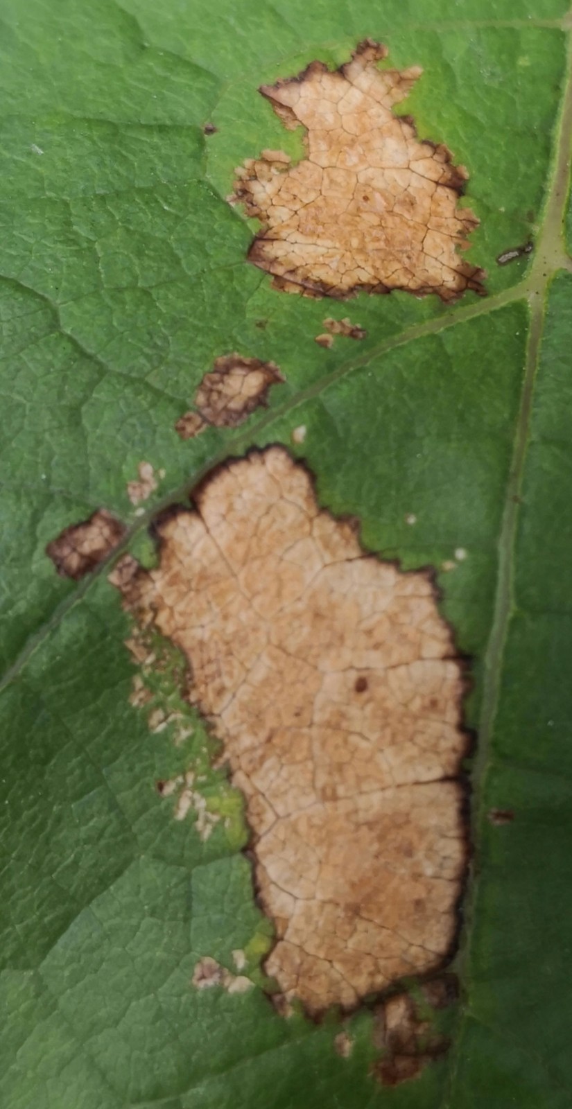 a nebude to len nejake poskodenie zaschnutym postrekom prip. nieco podobne? mi pride zvlastne ze je oblast poskodenia na vsetkych foto tak jasne ohranicena. iba cast listu a inde nic