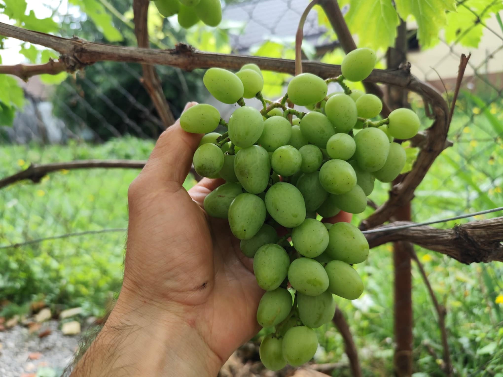 U mě už je poměrně silný muškát, ale zralá ještě není, chybí víc cukrů a lahodnější chuť. Arni má letos muškát poměrně slabý a především má tak malý hrozen a bobule, že vypadá jako bezsemenná odrůda. Je to slabě rostoucí keř.