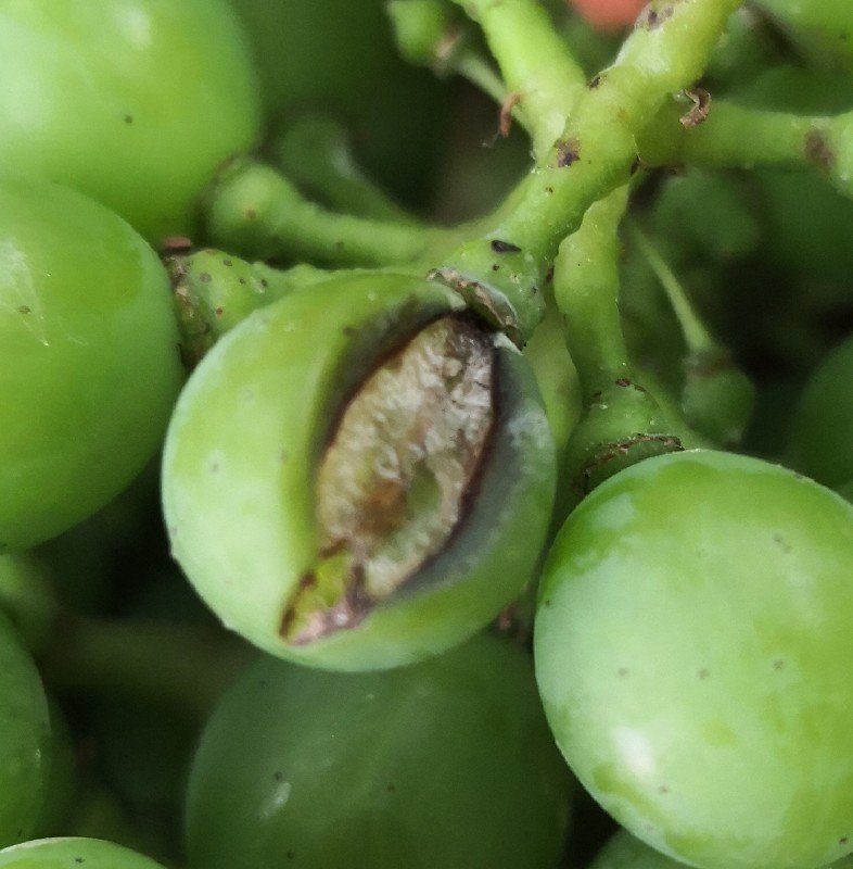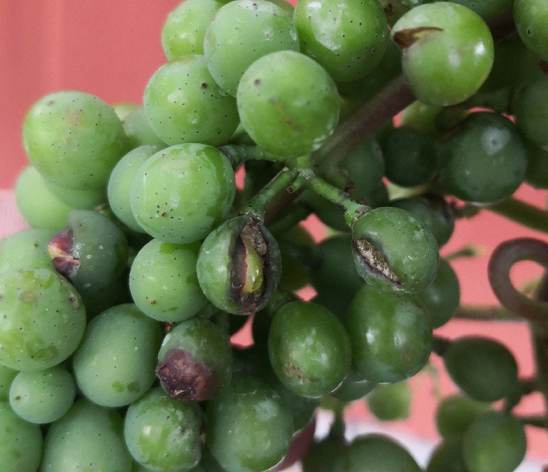 Čierna hniloba vodu z bobule spotrebúva, teda znižuje tlak v bobuli a tá sa skôr scvrkáva než praská. Niektoré bobuľky tam máš scvrknuté a niektoré prasknuté. Praskliny robí múčnatka, ale to by ju bolo vidno na bobuľkách. Každopádne je to nejaký neštandardný prejav choroby. To bude záhada roku.