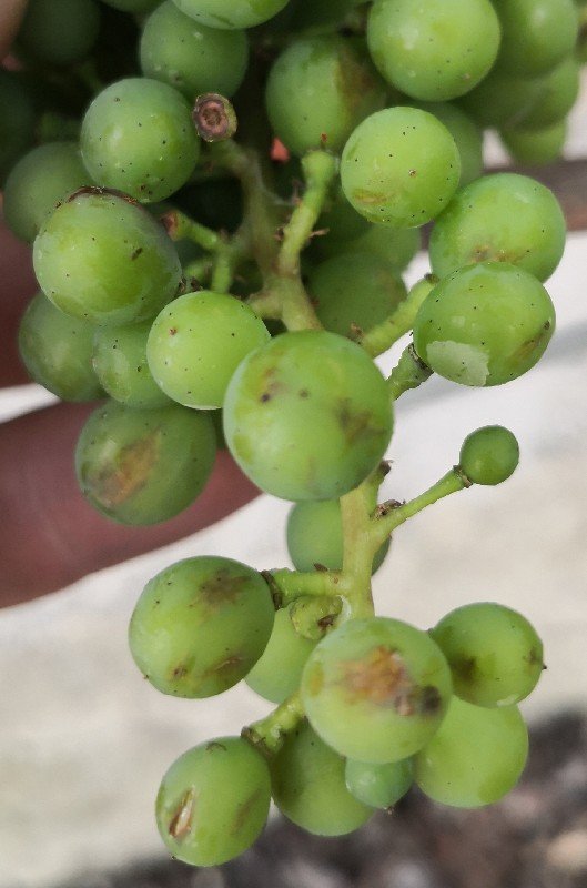 Jirka, pozri toto video. Skús to porovnať zo svojími strapcami. Je tam pokus a výsledok za 24 hodín. Len mechanické poškodenie a nič viac. Chlapík hovorí že v tejto fáze pred zamekaním sú bobuľky citlivé, čo je logické, pretože sú také "krehké". Nie sú citlivé do štádia hrachu, kým sú úplne tvrdé a potom keď zmäknú. Tiež hovorí že množstvo ľudí nevie čo to je a mnoho z nich už berie postrekovač do ruky, pritom nie je dôvod. Znamenalo by to že čím viac budeš strapce kontrolovať a prehadzovať, tým to môže byť horšie. Mohol ich poudierať aj vietor, alebo čokoľvek iné.