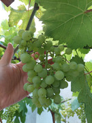V tohtoročnom ratingu bude Nachodka patriť určite medzi moje top odrody. Rast má u mňa mizerný a tenučké výhony bez osečkovania majú stále len 1,2 až 1,5 metra (2-3 ks sú možno teraz na vrchnom dvojdrátí). Neviem či to je spôsobené tým, že môj sused za plotom (ktorého už volám "chemický Ali") tento rok ak dobre počítam už tri krát striekal záhradu Roundupom a samozrejme občas mu to frkne aj ku mne (po poslednom poškodení pár iných koreňov sľúbil, že už sa to nebude opakovať) alebo je to spôsobené, že kúsok vedľa rastie veľká marhuľa. Napriek mizernému rastu, čo je vlastne fajn na zelené práce, som nechal na každom výhone po jednom peknom strapci v rozmedzí od 300 do 500 gramov a hrozno už je dokonale zrelé. Výborná chrupľavá bobuľa, perfektná muškátová chuť a aktuálne už je aj sladký ako "cumeľ". Na konci sezóny budem vyraďovať desiatky koreňov ale Kišmiš Nachodku určite jeden koreň budúcu jar dosadím, lebo takého hrozna je stále málo. Skutočne na túto odrodu môžem v tomto roku povedať len samé superlatívy. Inak to s tým rastom je zvláštne. U iných odrôd pri takom mizernom raste by bolo potrebné odstrániť z výhonu celú násadu strapcov. Ja som len redukoval z dvoch strapcov na výhon na jeden kus a hrozno je na začiatku augusta už perfektne zrelé, takže ten rast ako keby nemal u tejto odrody žiaden vplyv na zretie, na akumuláciu cukrov a chuť.